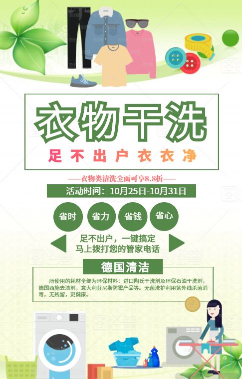 : 活动前7天(25-31号),各类衣物,床上用品等清洗全面可享 8.8折(每户业主可享受一次)