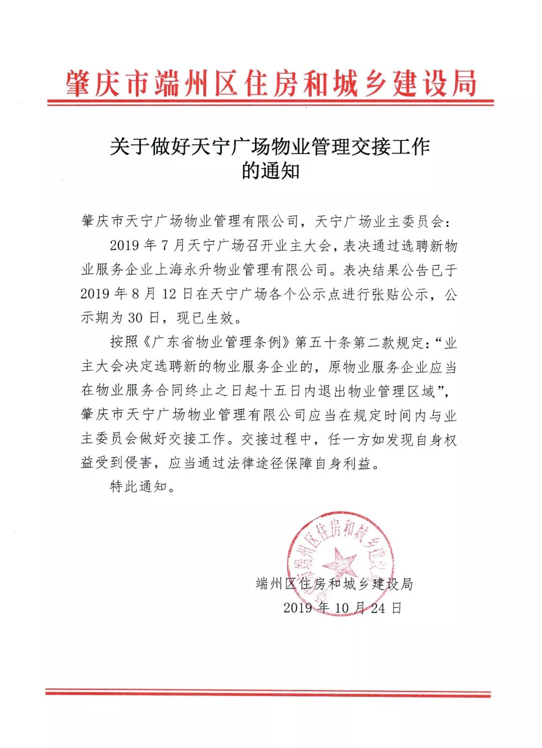 肇庆市端州区住房和城乡建设局---------------------------------------------------关于做好天宁广场物业管理交接工作的通知肇庆市天宁广场物业管理有限公司,天宁广场业主委员会:2019年7月天宁广场召开业主大会,表决通过选聘新物业服务企业上海永升物业管理有限公司。表决结果公告已于2019年8月1 2日在天宁广场各个公示点进行张贴公示,公示期为3 0日,现已生效。按照《广东省物业管理条例》第五十条第二款规定:“业主大会决定选聘新的物业服务企业的,原物业服务企业应当在物业服务合同终止之日起十五日内退出物业管理区域”,肇庆市天宁广场物业管理有限公司应当在规定时间内与业主委员会做好交接工作。交接过程中,任一方如发现自身权益受到侵害,应当通过法律途径保障自身利益。特此通知。端州区住房和城乡建设局2019年10月24日