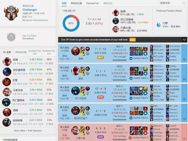 在最近的欧服排名中,DWG打野Canyon玩家在排位赛中连续赢得了四场胜利,并以1653分王者的分数成功登顶欧服。而使用次数最多的英雄是盲僧,挖掘机和塔利亚。在Canyon的比赛记录中,我们可以看到他总共进行了225场排位赛,其中有161胜64负。值得一提的是,他的几个招牌英雄胜率都非常高,最可怕的就是他的死歌胜率,24场比赛胜率高达94%,真的是很猛的。