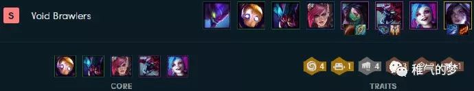 虚空斗刺阵容在上个版本位于AB级,但是在9.21版本重新成为了版本的S级榜首的阵容,虚空斗刺的阵容能针对许多有主C的阵容,四虚空提供的真实伤害能让卡莎这张刺客牌更好的进场打出收割的效果,四斗士在前排吸收伤害提供的坦度对抗能力还是很强的。