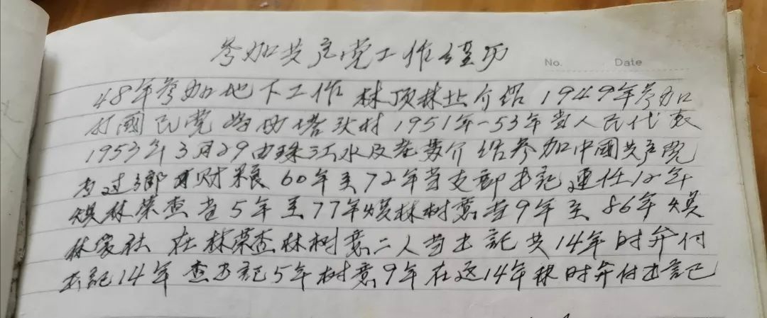 日记本里,林时弁记录着自己这一生参加共产党的经历。1948年,24岁的他参加共产党组织的地下工作,第二年,他还参加解放战争。1953年,他正式加入共产党,在当时的乡政府工作。