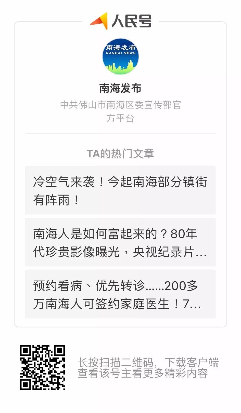 扫码关注南海发布人民号