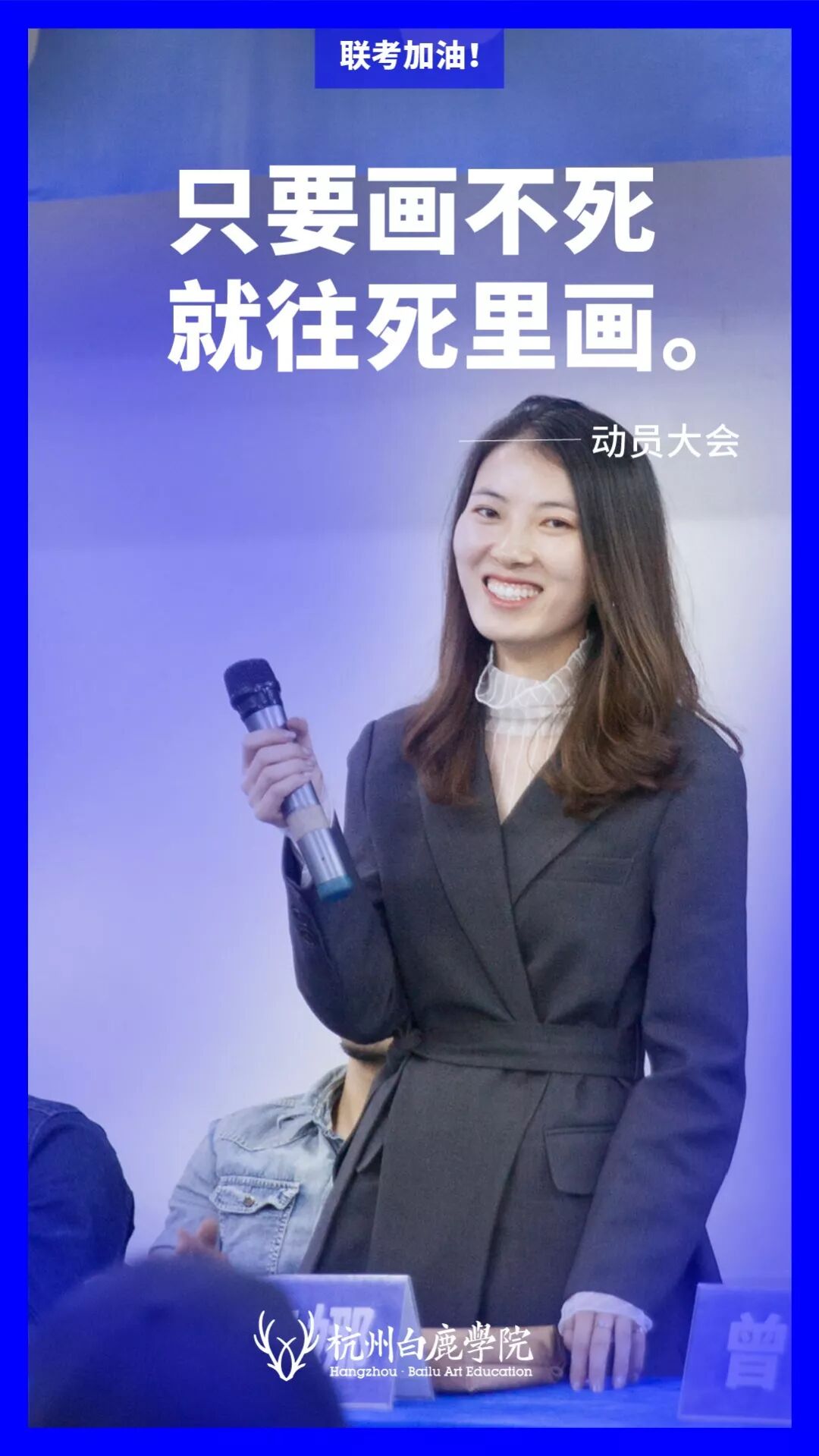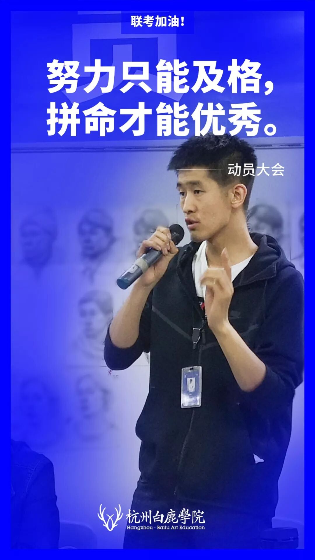 臧富龙校长发言中指出,杭州白鹿学院拥有一个朝气蓬勃的团队、汇聚名师的团队,也庆幸拥有一批可爱、优秀、刻苦的学生。联考是同学们艺考路上的第一个大考,也是最重要的一次考试,只要同学们有信心,在接下来的冲刺阶段中全力以赴,调整最佳状态,定将实现最终的胜利。
