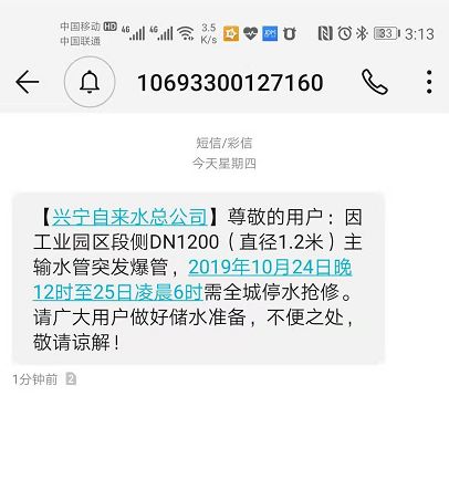 【兴宁自来水总公司】尊敬的用户:因工业园区段侧DN1200(直径1.2米)主输水管突发爆管,2019年10月24日晚12时至25日凌晨6时需全城停水抢修。请广大用户做好储水准备,不便之处,敬请谅解!