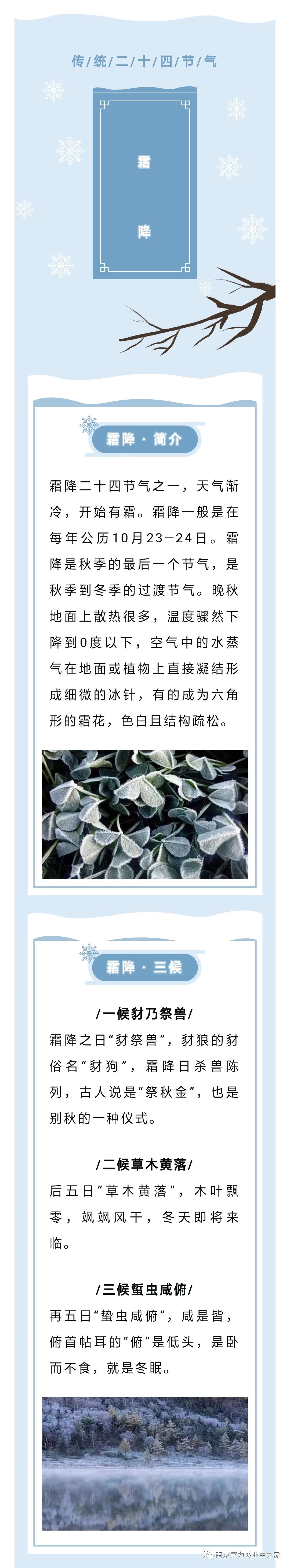 【南京富力城业主之家】养身提醒:10月24日为二十四节气中的『霜降』,也是秋天中最后一个节气,提醒业主注意天冷了要多保暖!