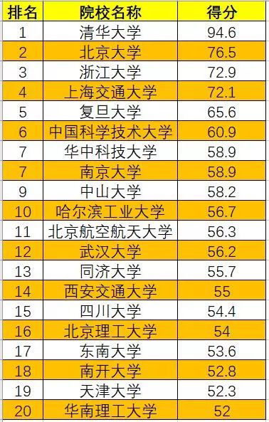 其中总得分在70分以上的,除清华大学之外,还有北京大学、浙江大学和上海交通大学,具体20强的排名如下: