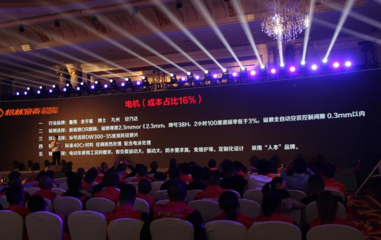 之后,格林豪泰研发总监靳磊上台,针对格林豪泰优质供应链进行发言,他从电机、车架、控制器、大灯等多个方面完美诠释了格林豪泰能够成为行业品质标杆的重要原因。