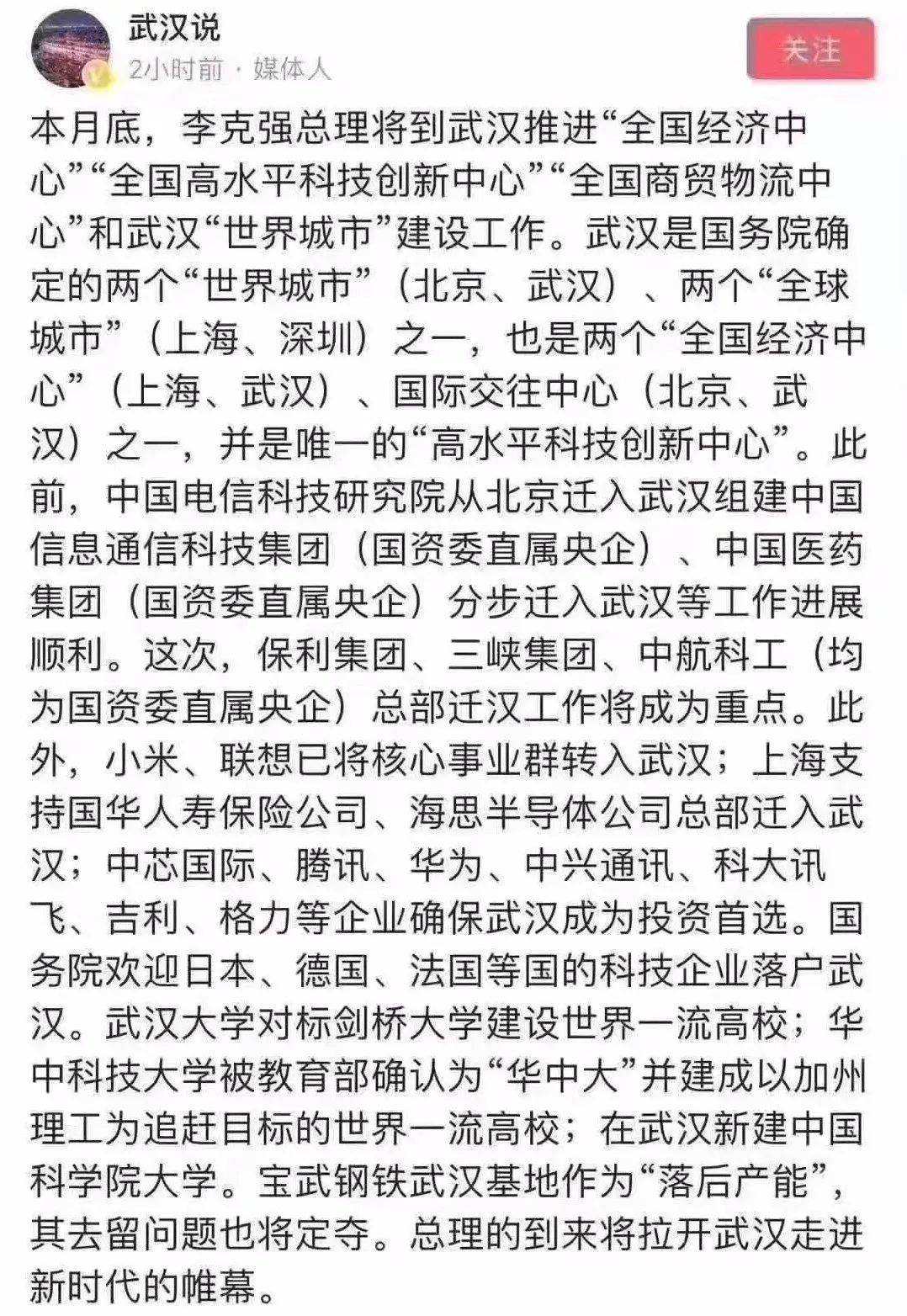 1,消息中描述“武汉是两个世界城市(北京、武汉)、两个经济中心(上海、武汉)、两个国际交往中心(北京、武汉)之一”。真实情况是武汉定位为强二线城市,真实排名应该在TOP10,远未达到TOP3甚至TOP 2的级别。
