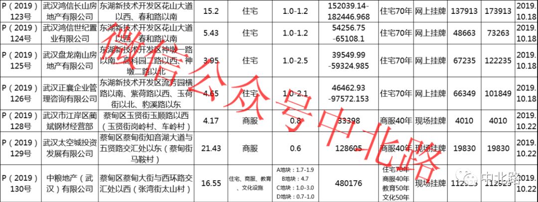 微信公众号中北路10月18、22日武汉土拍结果详版