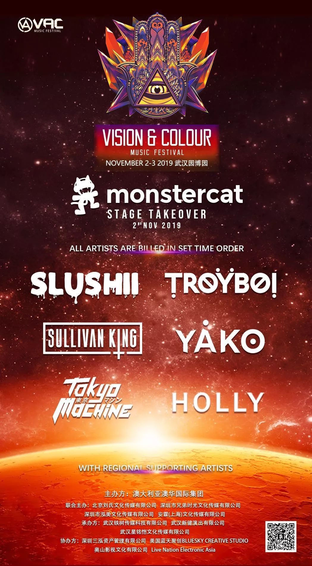这一次VAC电音节Monstercat舞台的阵容包含了Slushii, Troyboi, Sullivan King, Y?ko, Tokyo Machine和Holly!他们不仅人气爆棚,更有着强劲的实力,调动现场气氛更是他们的拿手好戏!他们各种音乐风格应有尽有,对观众来说,这是一场演出,更是一次享受!值得一提的是,刚刚在ADE与Monstercat签约的中国艺人Y?ko将会首次代表猫厂进行演出,这也是VAC电音节的一大看点。
