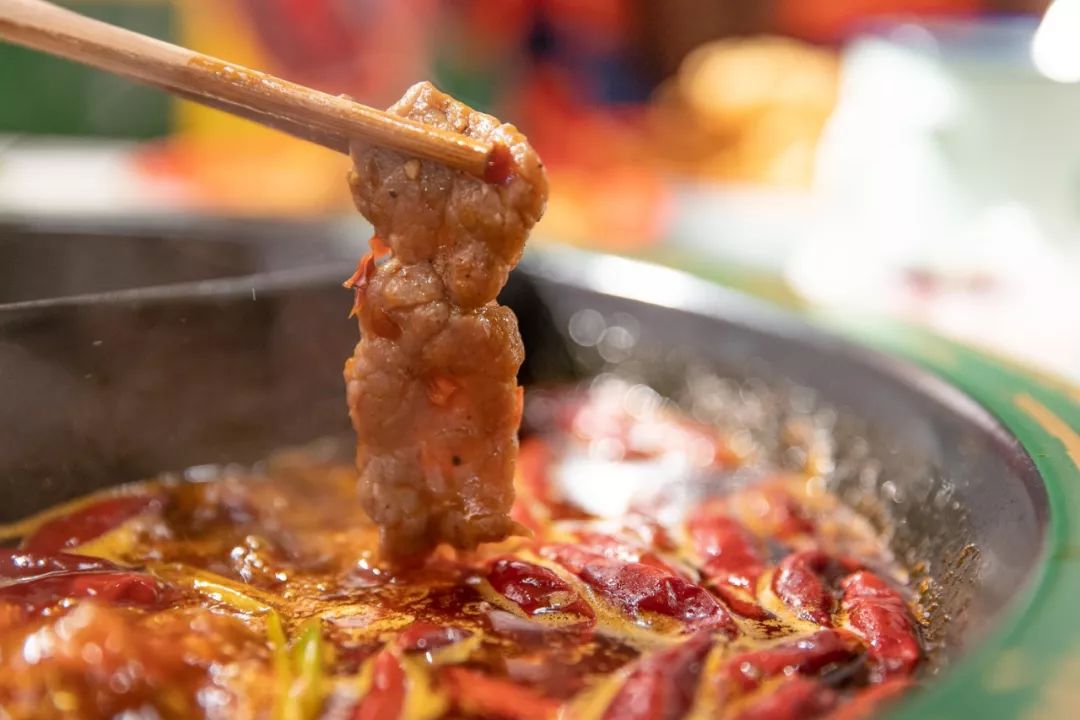 久煮不老的眉毛肉,入口Q弹,口感嫩滑;经过秘料腌制的双椒牛肉在沸锅滚几十秒吸饱牛油汤汁后捞出,一口下去麻辣鲜香。