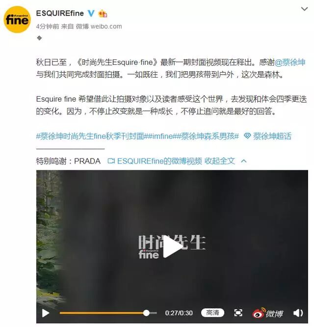 今日,蔡徐坤《时尚先生fine》封面视频公开,置身户外变身森系男孩的坤坤在拍摄时尚大片时是个高冷酷盖,将镜头表现力展现的淋漓尽致。但拍摄间隙,总会一不小心露出呆呆憨憨的笑容,诠释反差萌,一秒变小葵技能运用得太熟练了嗲,百变坤坤每天都给妈粉&女友粉带来惊喜~