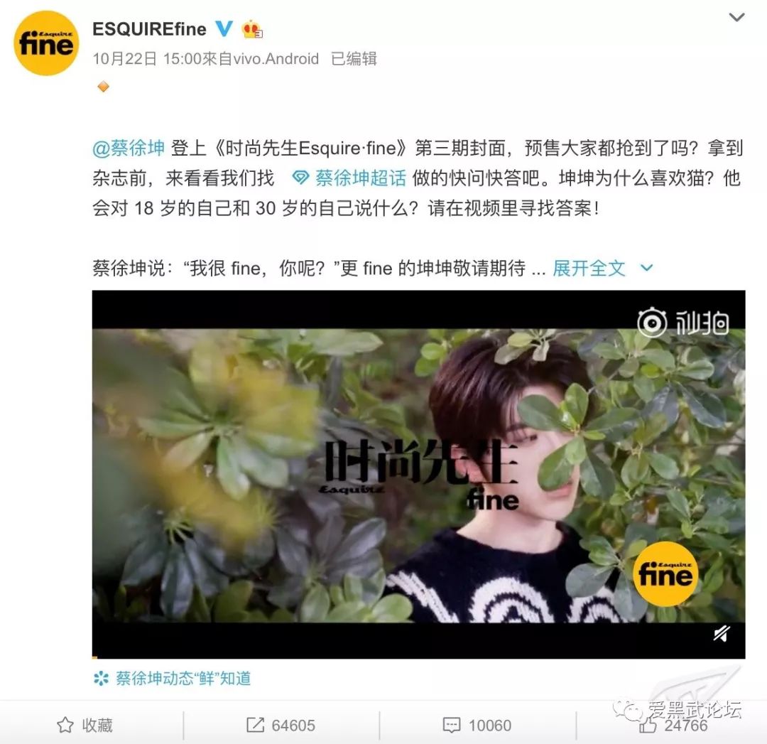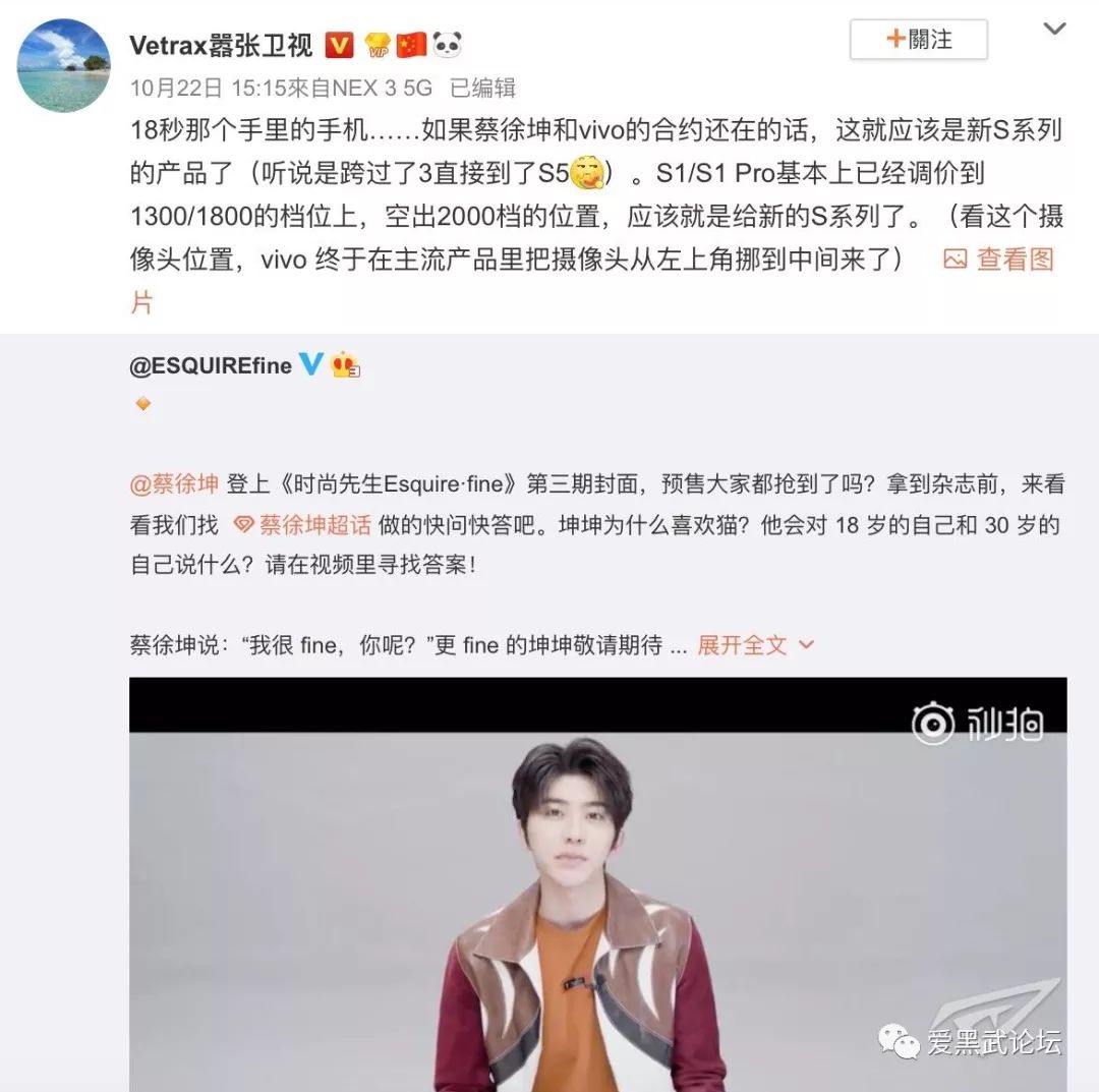 爱黑武消息,2019年10月24日,日前《时尚先生fine》在官方微博曝光了一条蔡徐坤的快问快答视频。视频中,蔡徐坤扮演记者角色,对自己展开趣味提问。几个简单问题的回答不仅展示出蔡徐坤当前的生活态度,更透露了他未来工作的新动向。视频一经发布瞬间引起了网友大量转发热议,短短半小时转发量已近4万,截止到目前,微博总转发量已达6万+。细心的网友发现,视频中蔡徐坤使用的“采访提问卡”非常独特,竟然是一款还未发布的新手机。