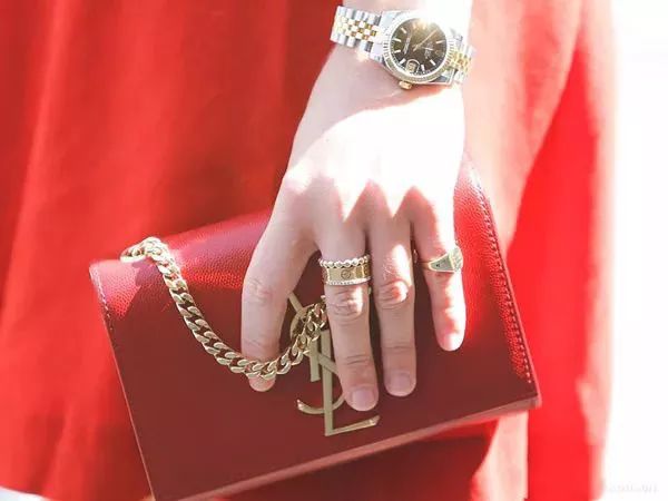比如,金戒指配金色链条包,银戒配银色反光面料包。