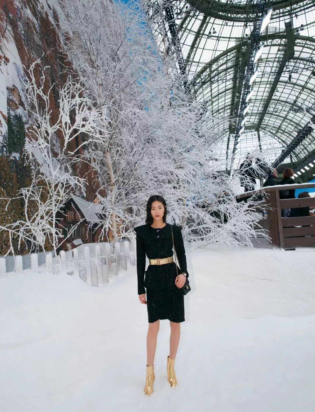 这次CHANEL2019秋冬大秀,大表姐刘雯以一身CHANEL黑色优雅软呢裙装出席秀场,搭配金色腰带作为点缀,巧妙地与金色短靴达成上下呼应,一身精致的look气场十足。