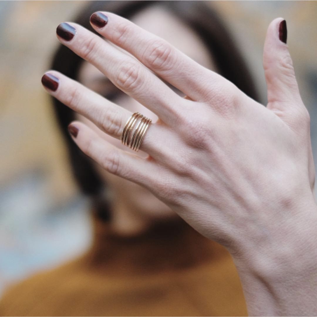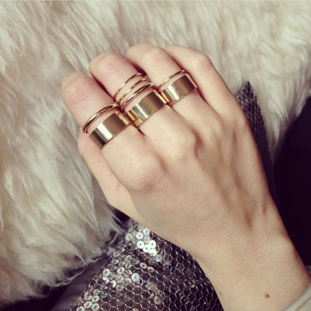 金色戒指的叠搭和小西装、长裙很配。
