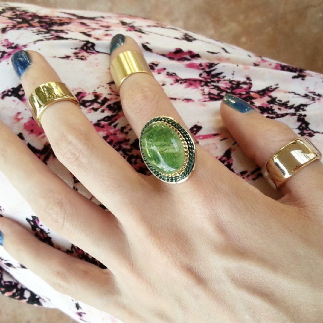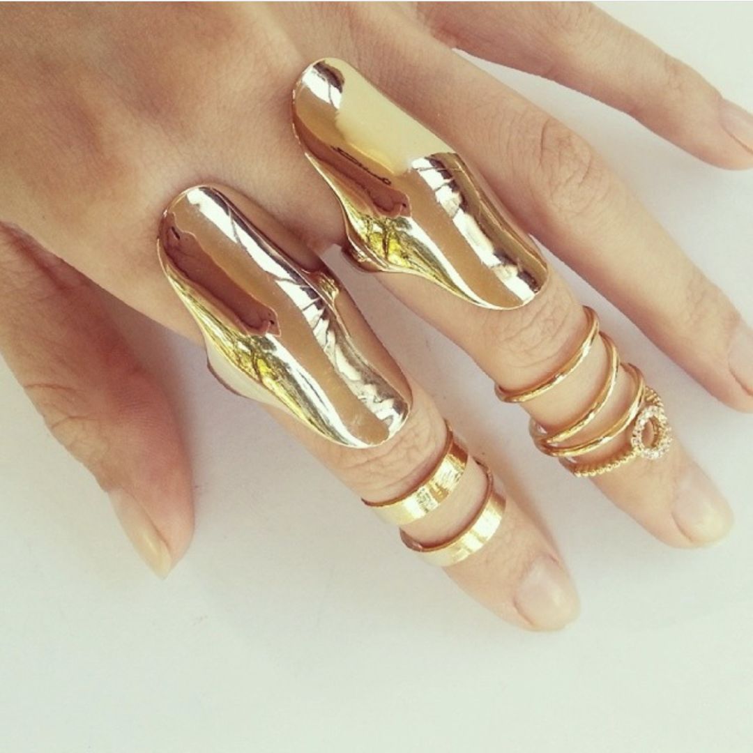 如果想让一手的戒指成为全身look的亮点,那就需要一颗大宝石或者闪亮的小钻戒来点亮你的戒指们。
