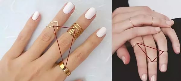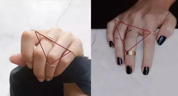 进阶版的是三角形法则,这是一个midi ring组合规则:选择3根手指佩戴戒指,将关节戒佩戴在中间手指上。