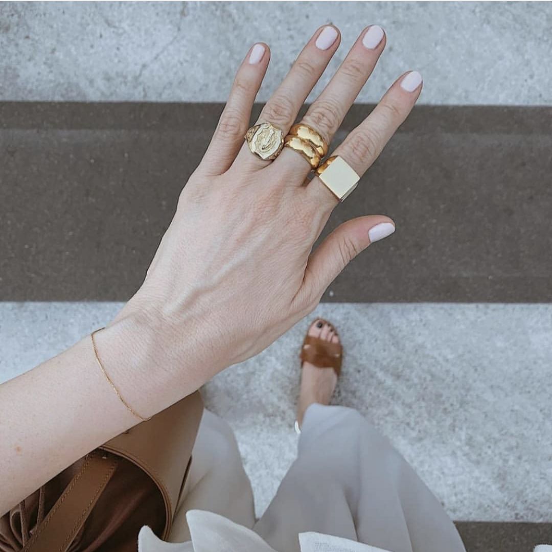 如果你想10个手指都戴满戒指,可以遵循“一大三小”原则,即夸张oversize款戴1-2枚即可,剩下戴个简单款。