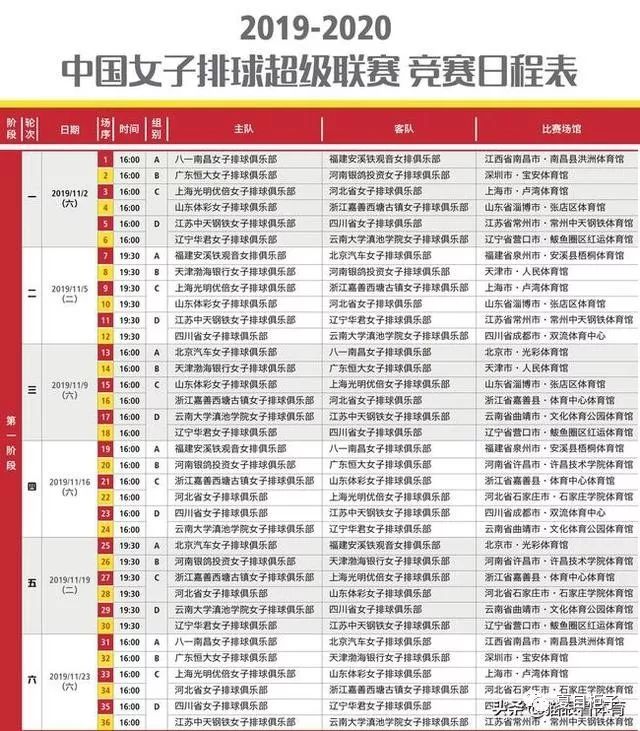 新赛季的女排排超联赛即将打响,近日,排协公布了第一阶段的竞赛日程表。第一轮比赛将于11月2日(周六)开始打响,第二轮的比赛将在周二,第三轮又将回到周六,以此类推。周二的比赛时间在晚上7点半,而周六的比赛时间在下午4点。第一阶段的竞赛将于11月23日结束。