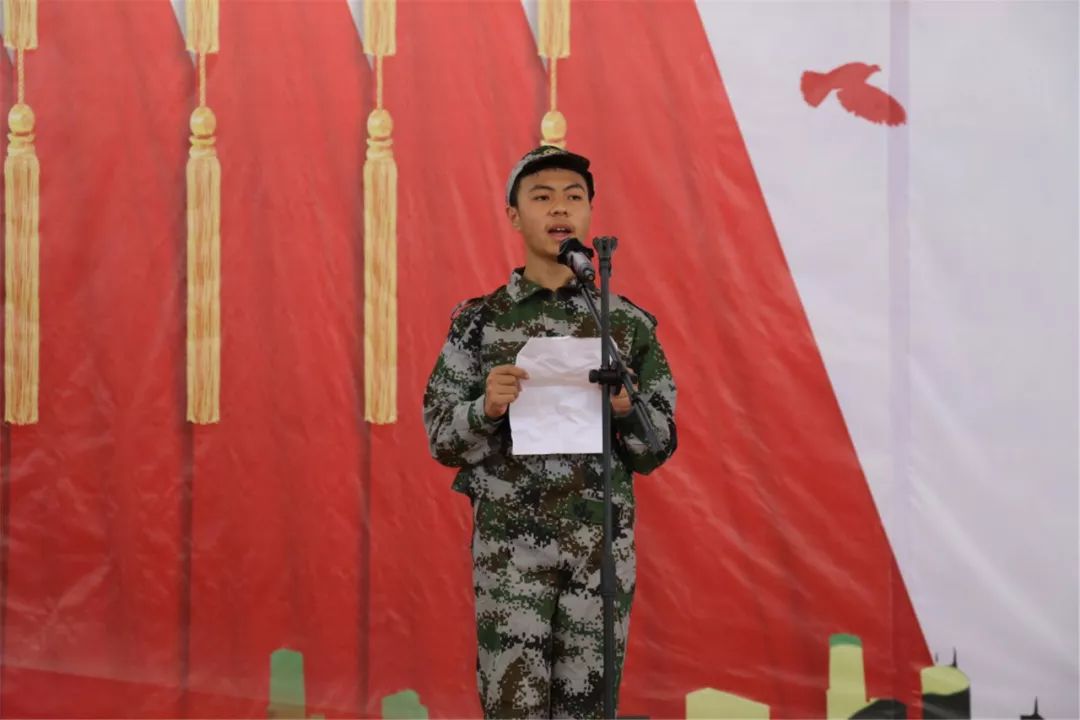 开营仪式第三项议程:学生代表何彦斌发言。何彦斌首先代表参加此次实践活动的全体学生向各位领导、教官表示衷心的感谢,并代表全体同学保证:尊重教官,服从领导,发扬艰苦奋斗精神,勇于吃苦,勇于锻炼,团结友爱,互帮互助,做遵守纪律的模范。