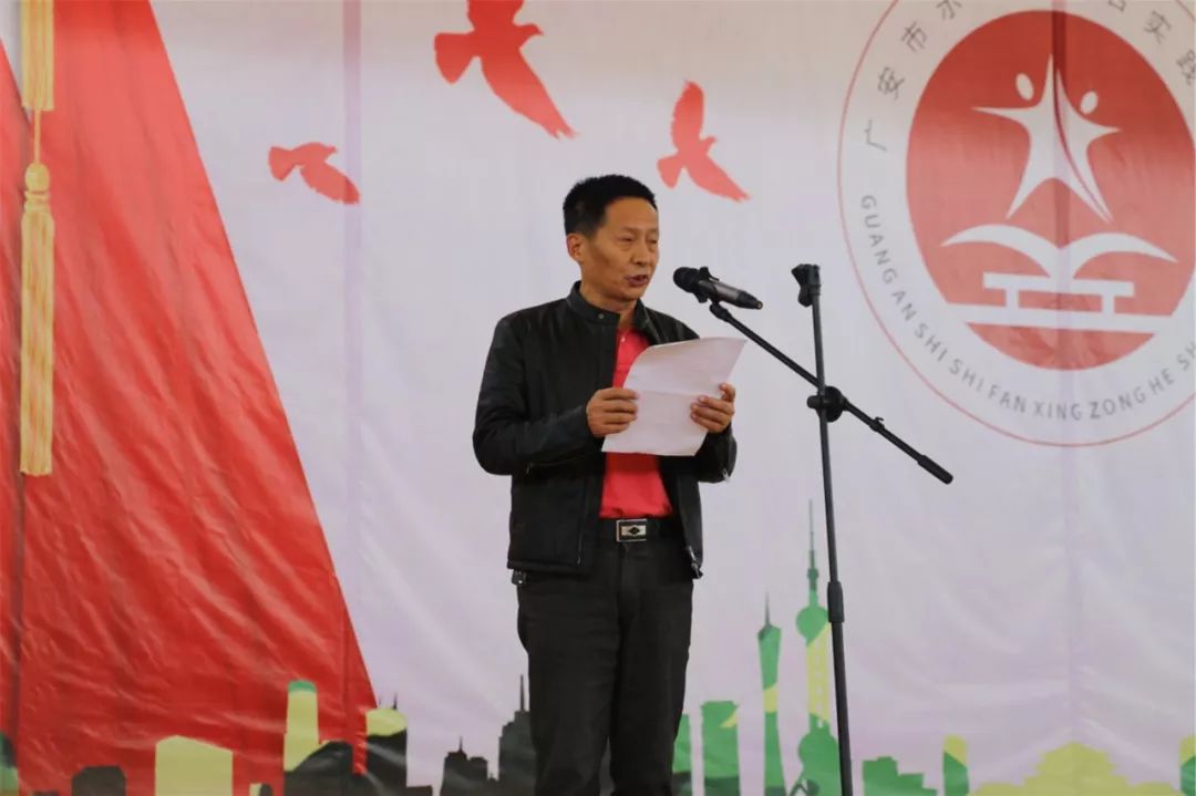 开营仪式第四项议程:我校党委副书记游顺利发表讲话。游顺利首先感谢广安市示范性综合学生实践基地为我校学生搭建了展示自我的平台,提供了学习、交流、锻炼和成长的机会。游顺利表示,生活中我们会遇到诸多困难,每一位同学都应该学会积极面对,想办法解决这些困难,磨砺品行,锻炼意志,而这次活动就是一次体验、锻炼、吃苦和学习的机会。游顺利强调,参训同学在此次实践活动中要注意安全,遵守纪律,互帮互助,学会自理,要服从基地教官领导的指示,遵守各项规章制度。最后,游顺利代表学校预祝本次实践活动圆满成功!