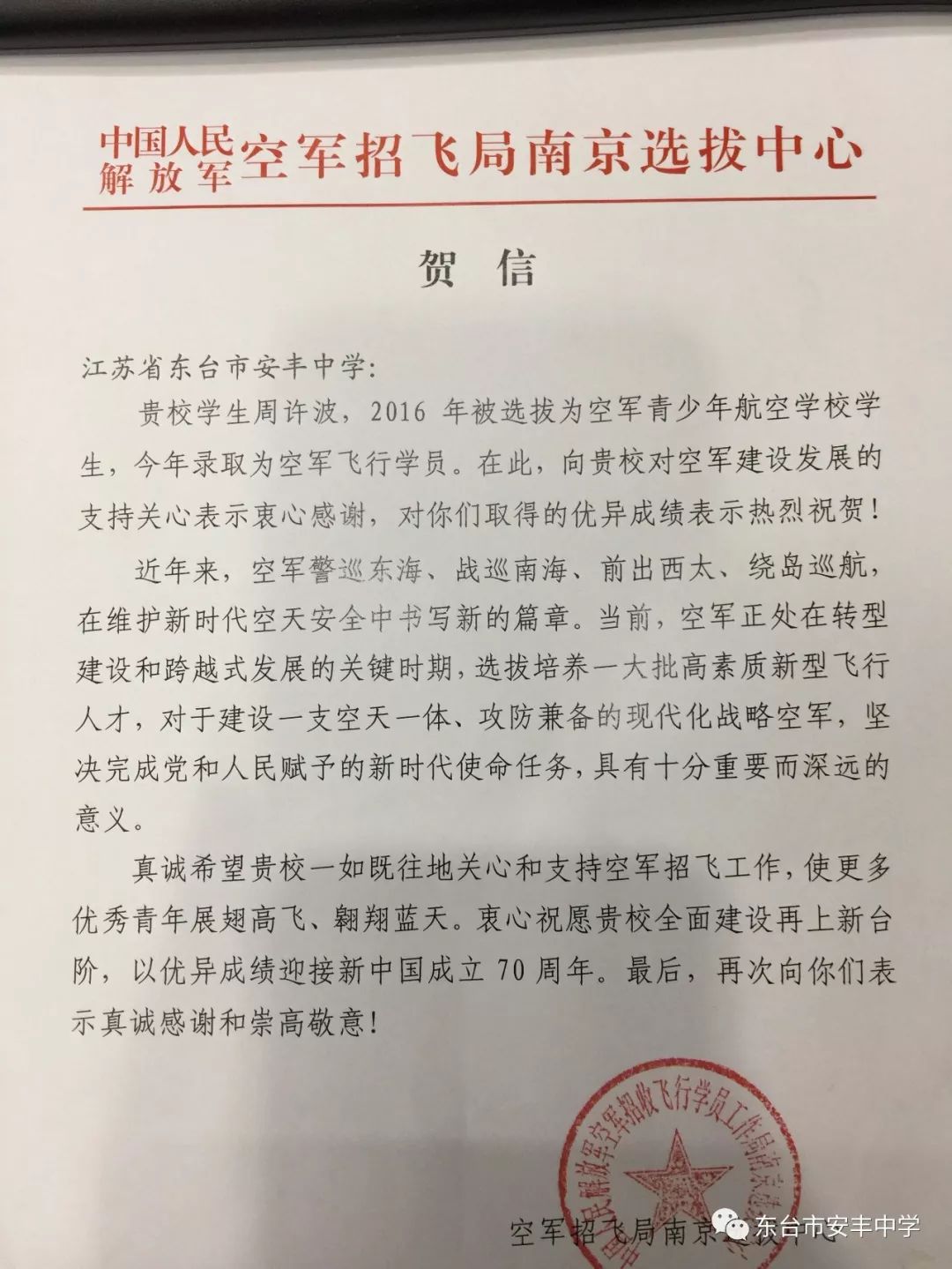 近日,在《中国机长》院线大卖之际,我市安丰中学收到空军招飞局南京选拔中心发来的贺信,安丰中学学生周许波今年录取为空军飞行学员!