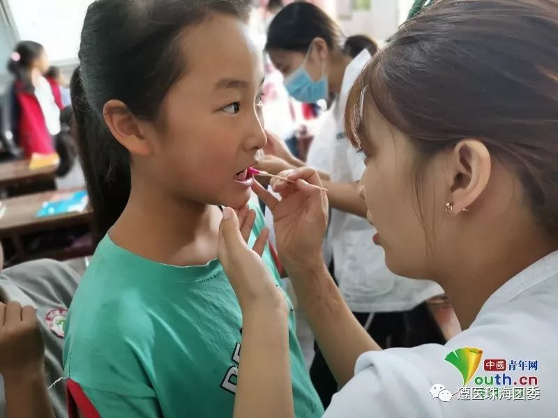 图为文艺汇演结束当天,志愿者正在为六年级的牙牙们涂牙菌斑指示剂,对比宣教前后效果,也让牙牙们认识藏在牙齿上的细菌。中国青年网通讯员 张陶 摄