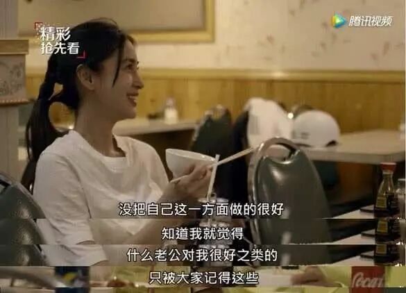 而老板娘讲完之后,Angelababy一听随即露出苦笑,并无奈地说:“觉得没把自己这一方面做得很好,(别人)知道我就都觉得什么老公对我很好之类的。”她坦言到只被大家记得这方面的事,非常不甘心,并透露她曾经朋友坦言最想有一部作品能够让大家记得,但现实却是没人会在乎自己到底是什么样子,她也认为观众只会关注精彩的、突出的言论,自己本来平淡的生活没有人会想看。