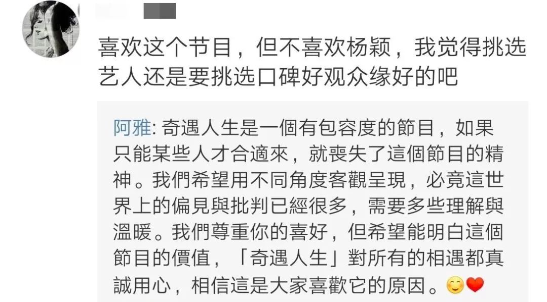 在阿雅回复网友的评论中,她这样说道:奇遇人生是一个有包容度的节目,如果只能某些人才合适来,就丧失了这个节目的精神。我们希望用不同角度客观呈现,毕竟这世界上的偏见与批判已经很多,需要多些理解与温暖。