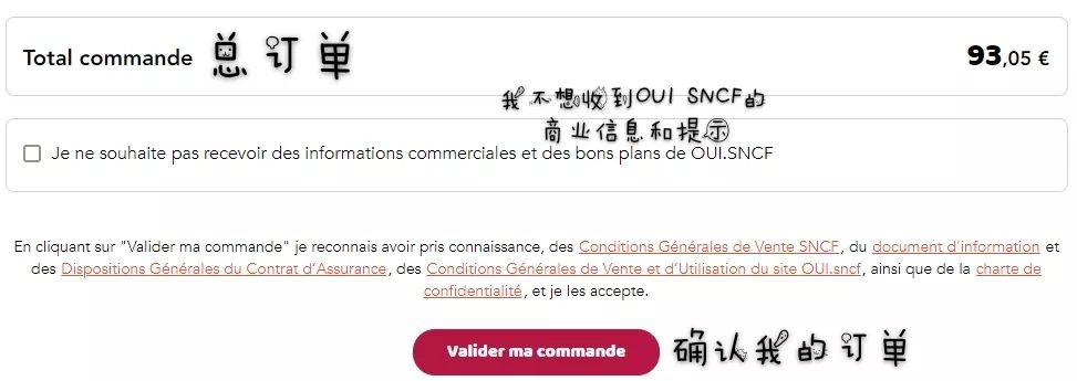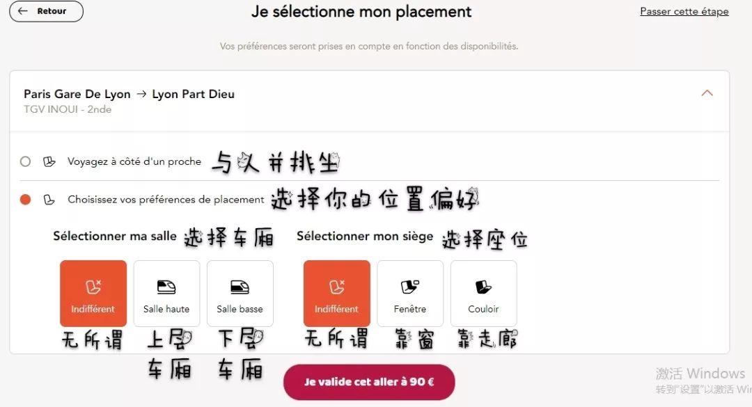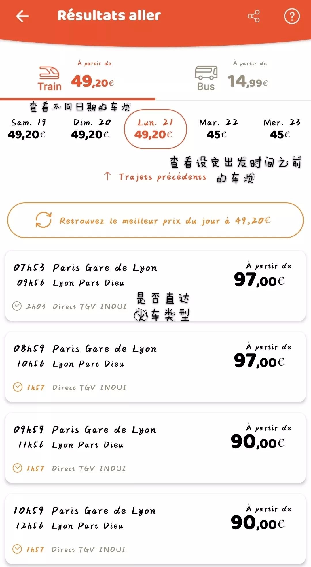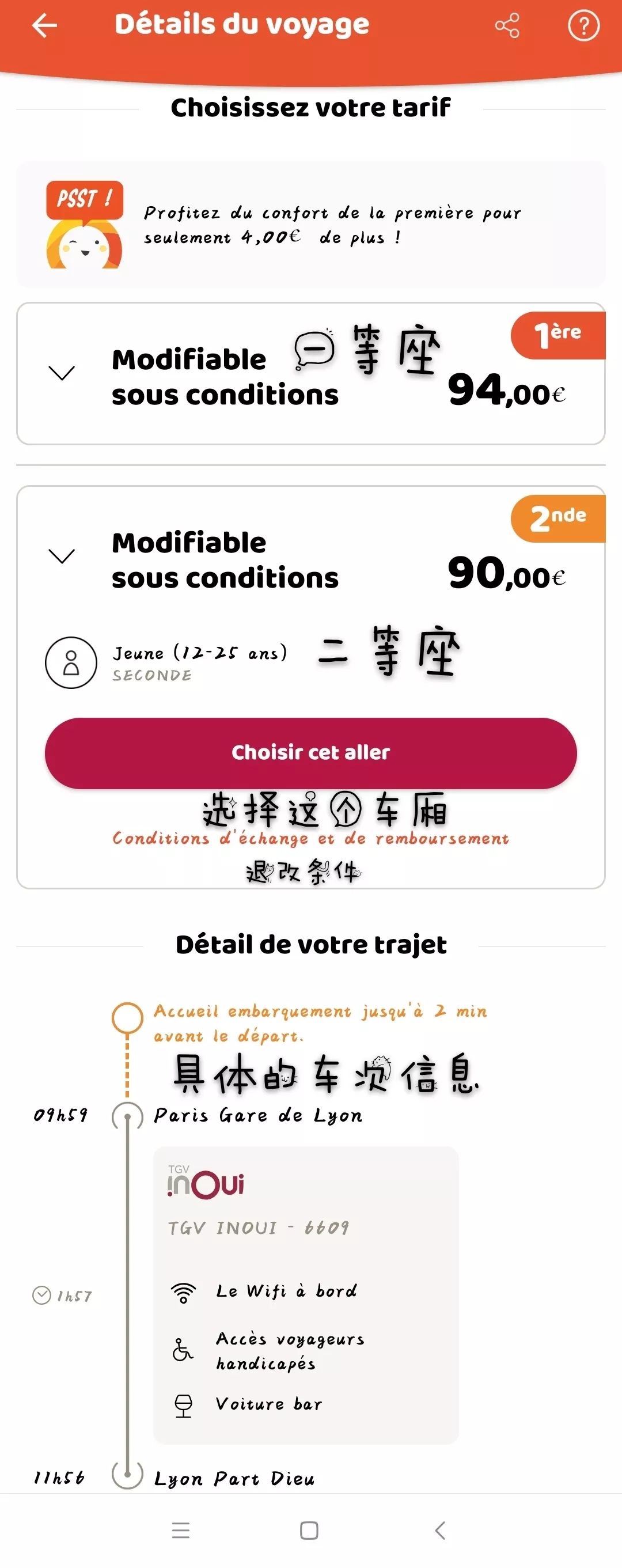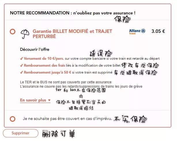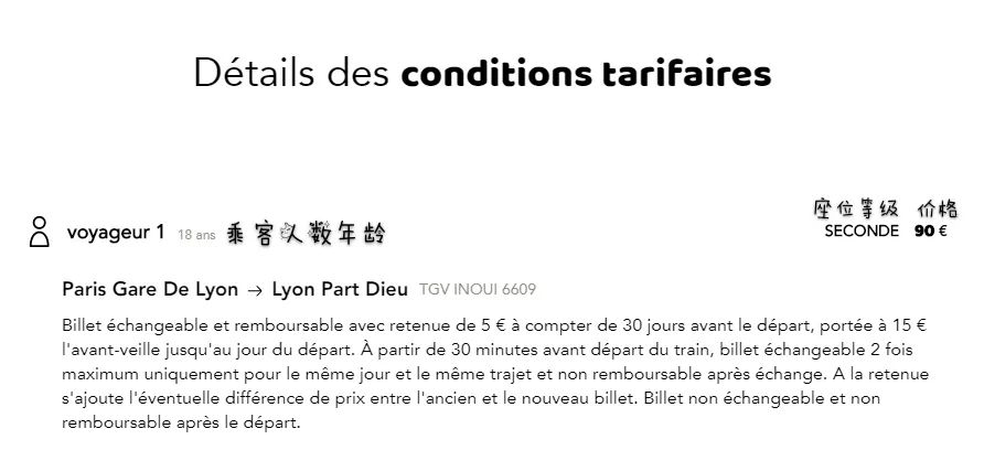 中转票:如果购买的是需要中转的联程票,上一趟列车晚点导致无法赶上下一班火车的话,到站后直接去信息处说明情况,然后就可以免费乘坐最近时间的一班列车,如果当天没有其他列车的话,SNCF会安排住宿