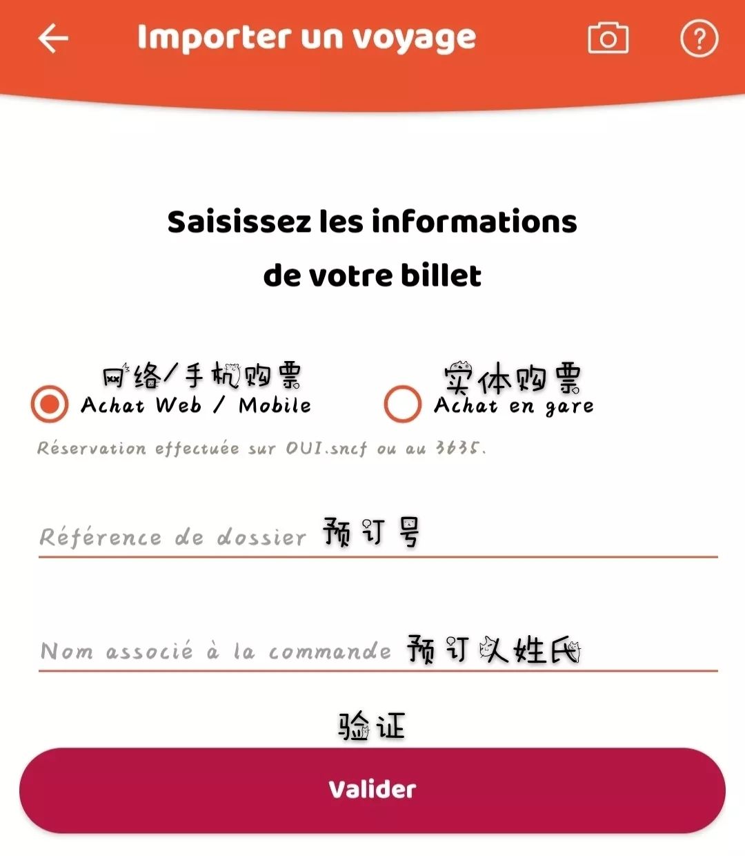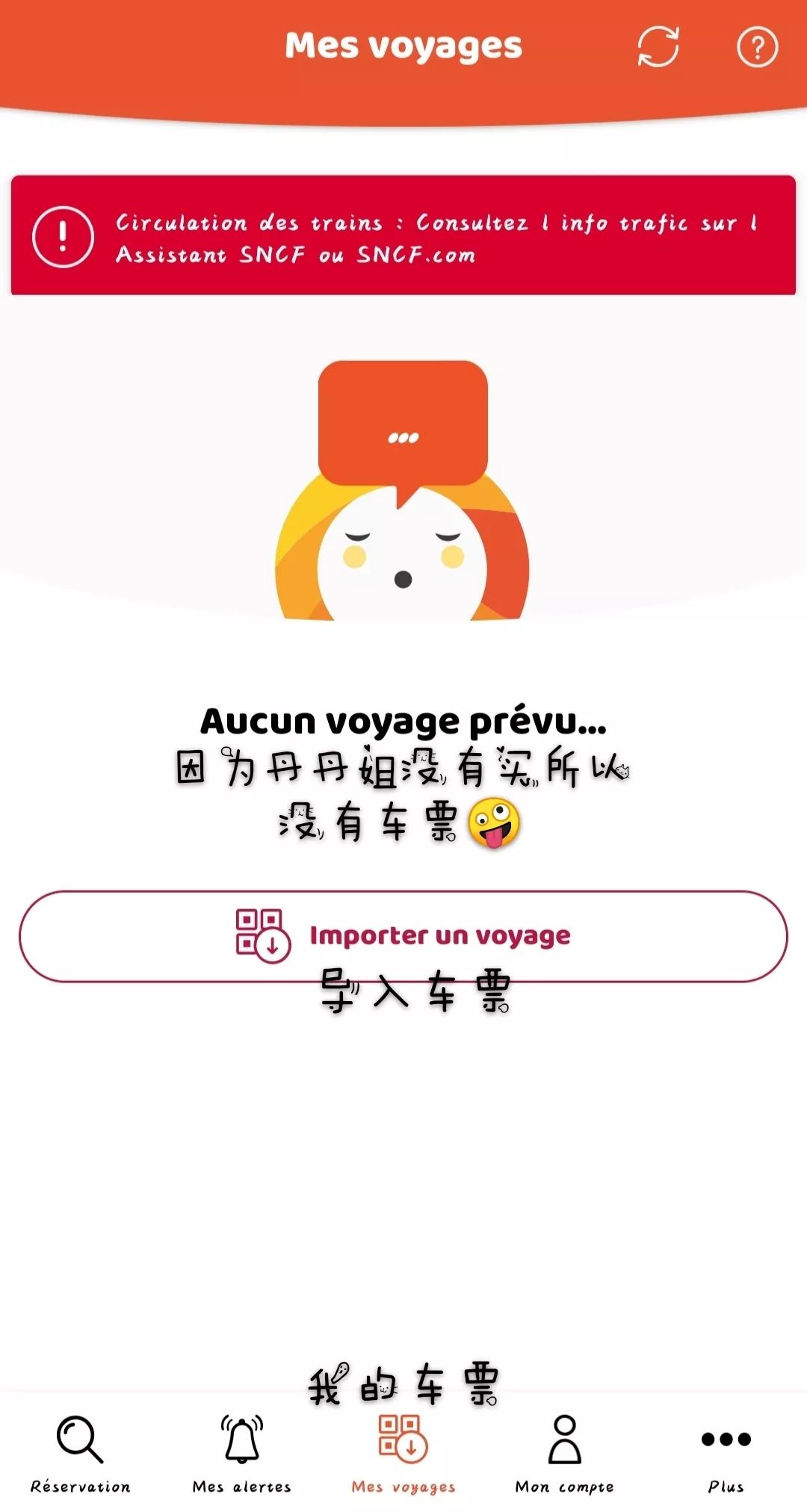 返回APP主页后,点击下方正中央的我的车票,就可以看到刚刚预定的车票了,如果想把之前在网站或者车站购买的电子票导入手机中,点击上方的“Importer un voyage”之后添加预定号和预订人姓氏之后就可以导入了,这里还会显示详细的车次信息。