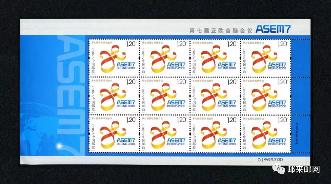 邮票主图为第七届亚欧首脑会议会标,会标由字母a和e组成中国结及蓝色亚欧会议英文简称和英文北京2008组成。其中字母a和e分别代表亚洲和欧洲;造型为中国结;字母e金色部分显现汉字“七”,表示会议届数;总体寓意为亚欧合作与和谐。