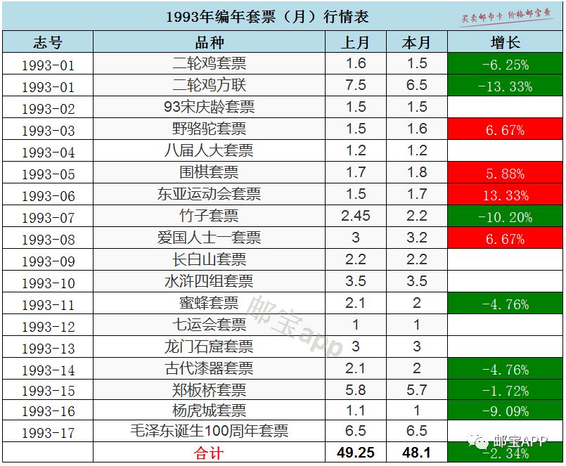 其他1993年套票价格变化请查看下表或前往邮宝APP查询。