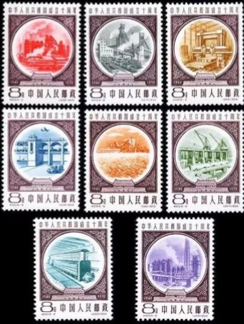 十周年分5组发行了共计19枚纪念邮票,内容包括中华人民共和国国徽、建国十年以来的经济建设成就、人民群众欢呼国庆等方面。