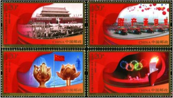 六十周年,4枚邮票分别为开国大典、改革开放、港澳回归、奥运盛典。小型张《祖国在我心中》。