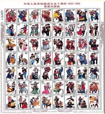五十周年——民族大团结,每枚代表一个民族,印制在一张整版之上,是新中国迄今为止枚数最多的一套邮票。