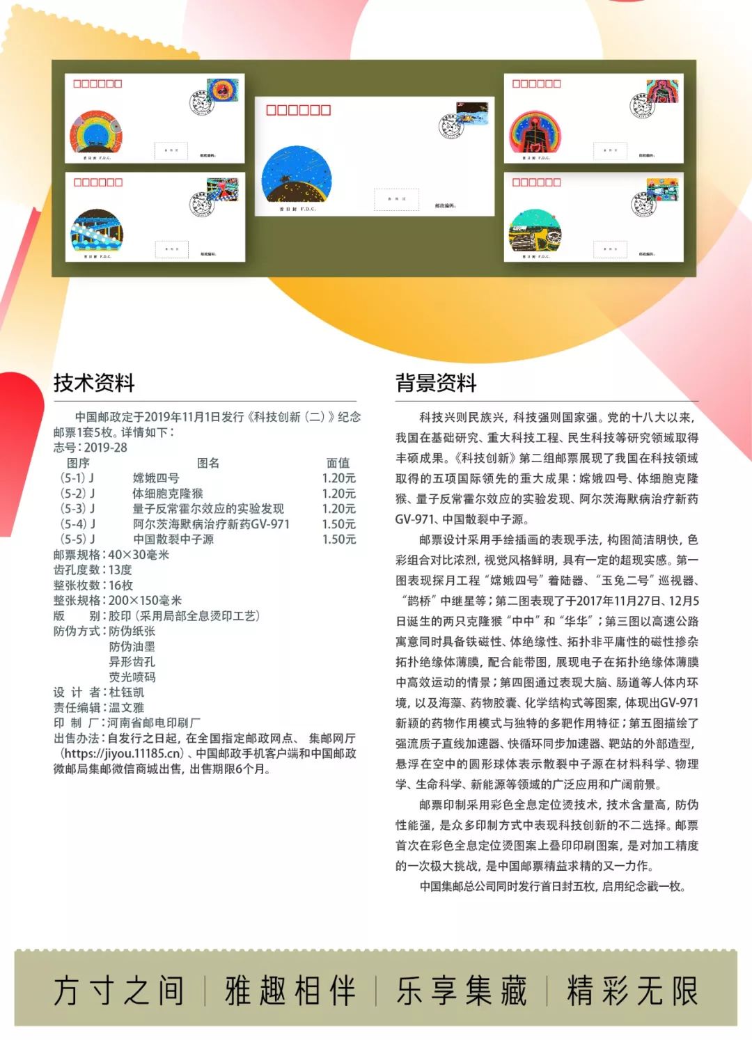中国邮政定于2019年11月1日发行《科技创新(二)》纪念邮票1套5枚。详情如下: