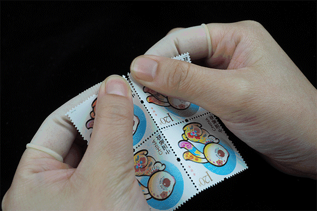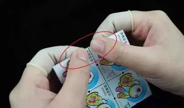 想明白了上面的两点,我们就要把食指带上指套了。这样在分撕时可以让我们用大拇指调整力度,而又避免食指与邮票背胶的直接接触。