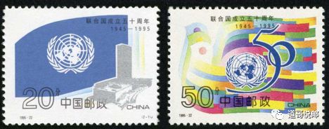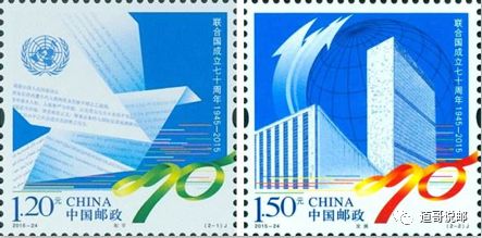 中国邮政分别于1995年10月24日发行了志号为1995-22的《联合国成立50周年》邮票,一套2枚;2015年9月26日发行了志号为2015-24的《联合国成立70周年》邮票,一套2枚.