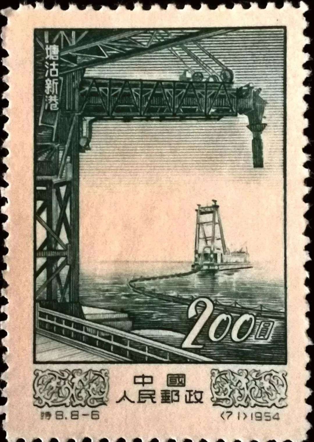 1954年5月1日,中国邮政发行了第一套反映祖国现代化建设成就的邮票,志号为特8的《经济建设》特种邮票一套8枚,其中第6枚名为“塘沽新港”(图片1)。