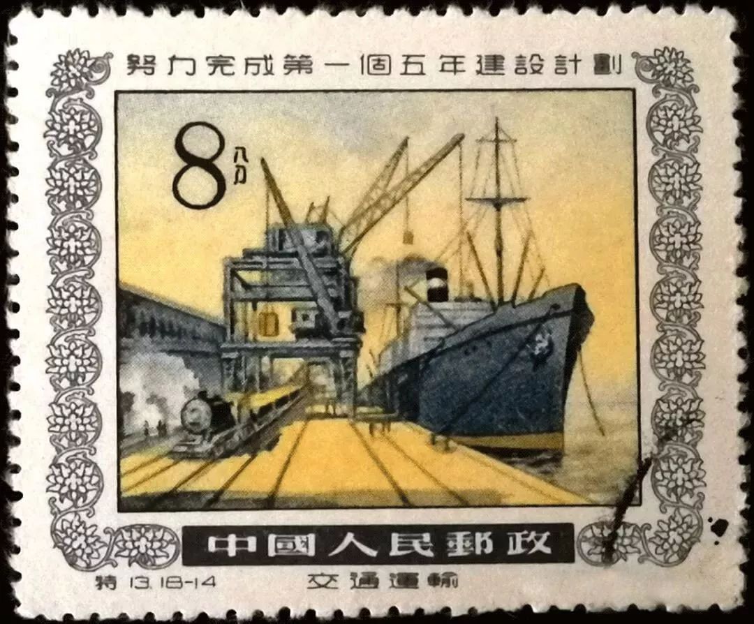 此后,中国邮政又陆续发行了一些港口邮票或含有港口元素的邮票。1955年10月1日,中国邮政发行志号为特13的《努力完成第一个五年计划》特种邮票一套18枚,其中第14枚为《交通运输》(图片2),图案为港口。