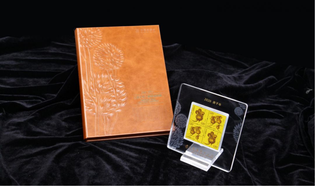 《庚子年》邮票金,配有进口高透耐磨的亚克力外壳及展示板、书形外包装盒及《庚子年》邮票金珍藏邮折,内含《庚子年》邮票版式二和产品收藏证书,是收藏鉴赏馈赠的佳品。
