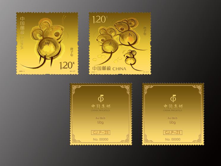Au99.99金料精工铸造,单色原大仿印2020-1《庚子年》邮票图案(一套两枚),制作10克、30克、50克、100克纯金制品。