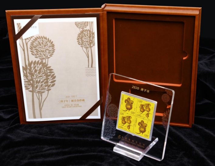 包装:《庚子年》邮票金砖除A款产品外,B、C、D各款产品均配有木盒、纸盒、手提袋等包装。A款产品配中国集邮总公司发行的《庚子年》生肖文化专题邮册,内含《庚子年》邮票套票、版式一、版式二、小本票、首日封等。