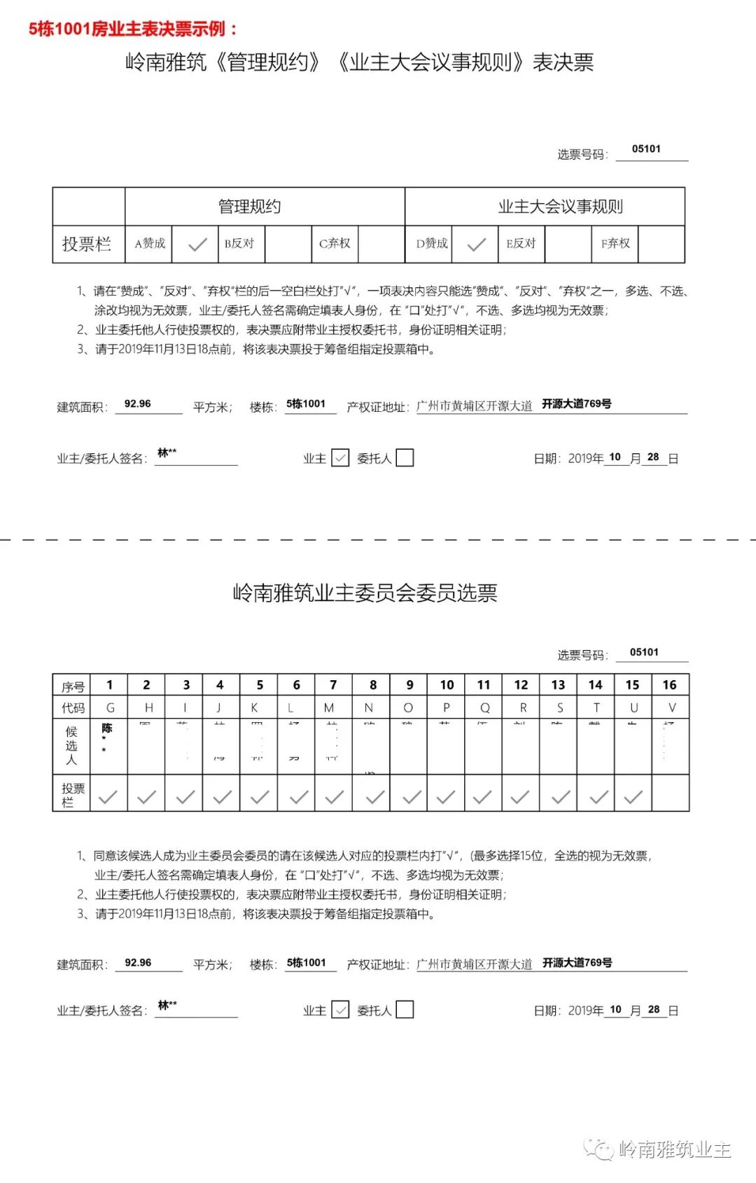 附件:《越秀岭南雅筑业主大会议事规则》和《越秀岭南雅筑管理规约》表决票填写示例图。