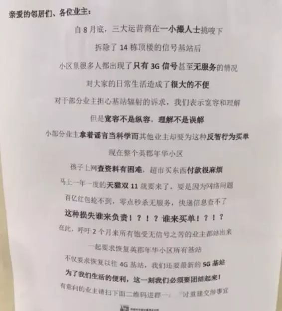 10月19日,该小区业主为参加双11网购,在小区公告栏呼吁运营商重装通信基站。
