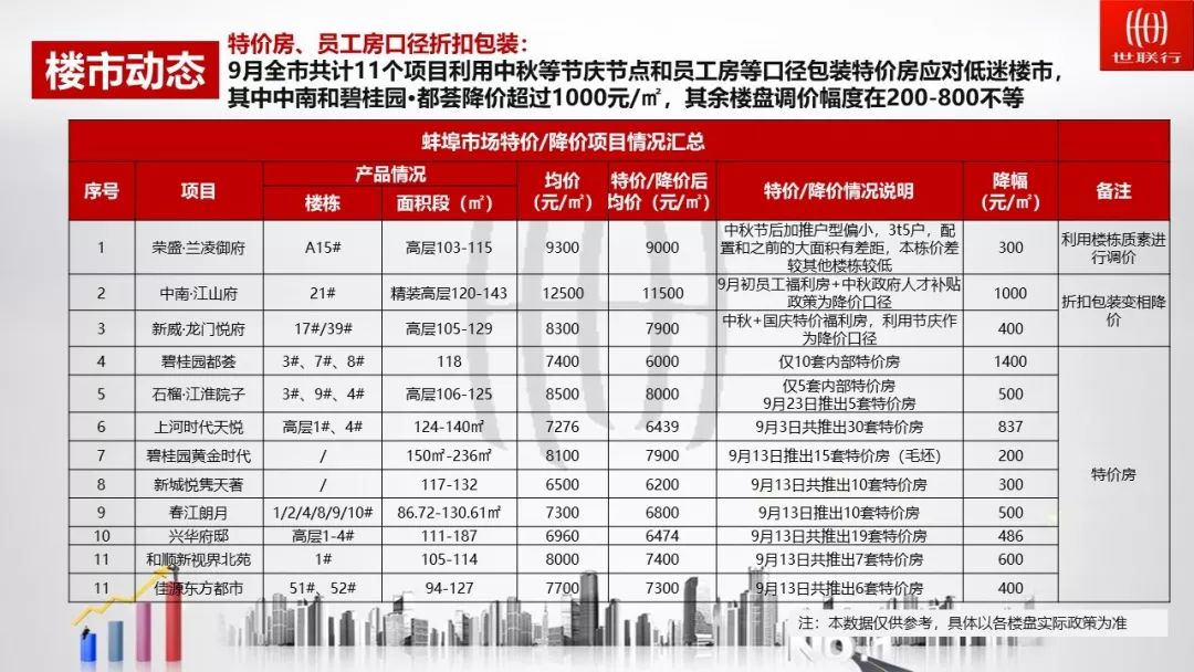 9月蚌埠11个项目推出特价房、员工房等变相降价,降价幅度200元-1400元/㎡。其中,中南江山府降价1000元/㎡,按照120-143的户型来计算,降价幅度在12万-14万,碧桂园都荟降价1400元/㎡,按照118户型计算,降价幅度约18万。