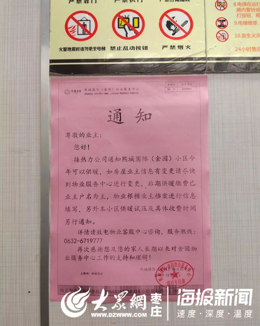 接到业主反映后,10月24日,大众网·海报新闻记者来到了滕州熙城国际金园,看到单元楼的电梯口张贴着关于供暖的通知,通知显示今年可以供暖。随后,大众网记者来到小区物业了解情况,物业大厅的一位工作人员表示,供暖问题已解决,小区将及时供暖,他们桌上的表格填写单正是在统计业主档案信息,另外小区供暖试压和具体收费时间将另行通知。