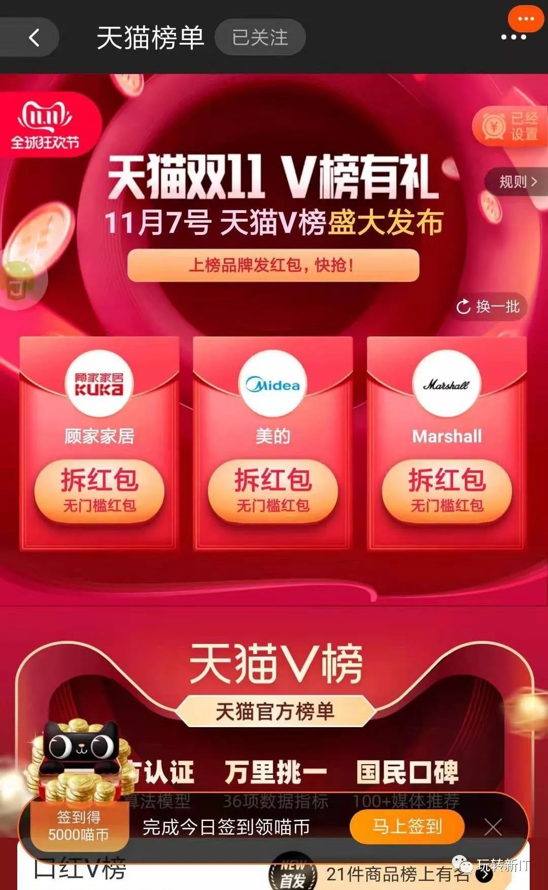 1. 天猫V榜有礼活动,活动期间可选择品牌拆红包,实测每个号都是0.2,活动时间为10月21日-11月11日,每天都可以拆红包,红包可叠加。